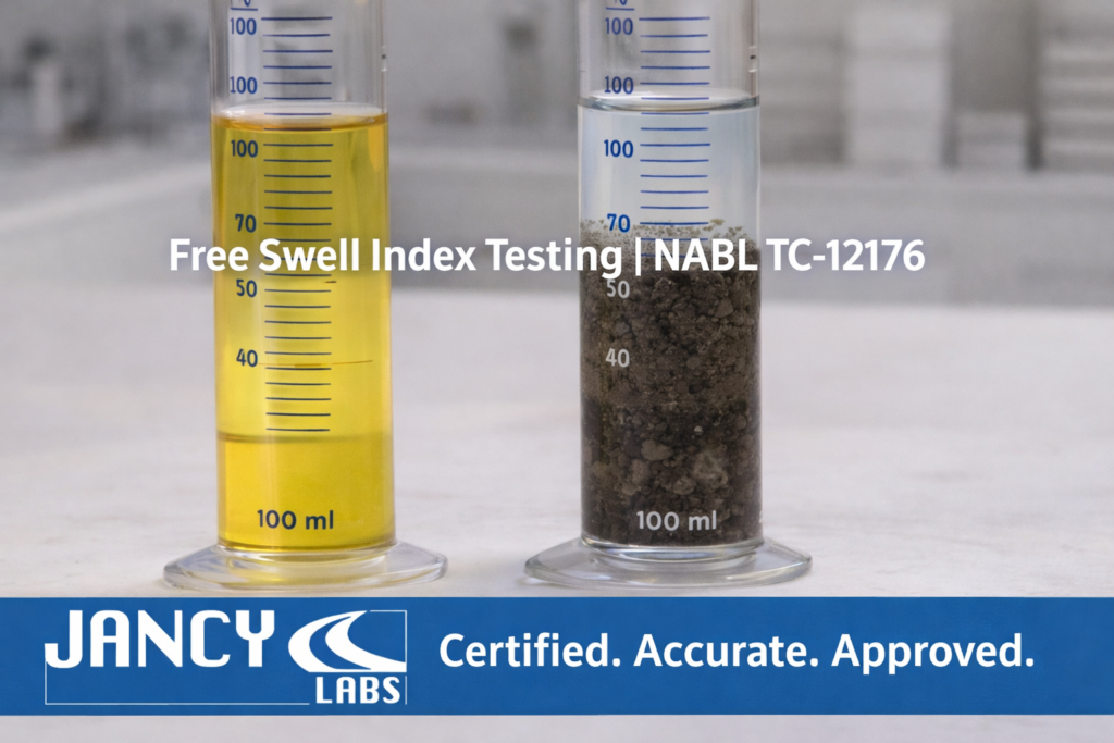 Jancy Labs provides accurate free swell index testing as per IS 2720 Part 40 — with NABL-certified reports ready for NHAI, PWD, and PMGSY submissions.