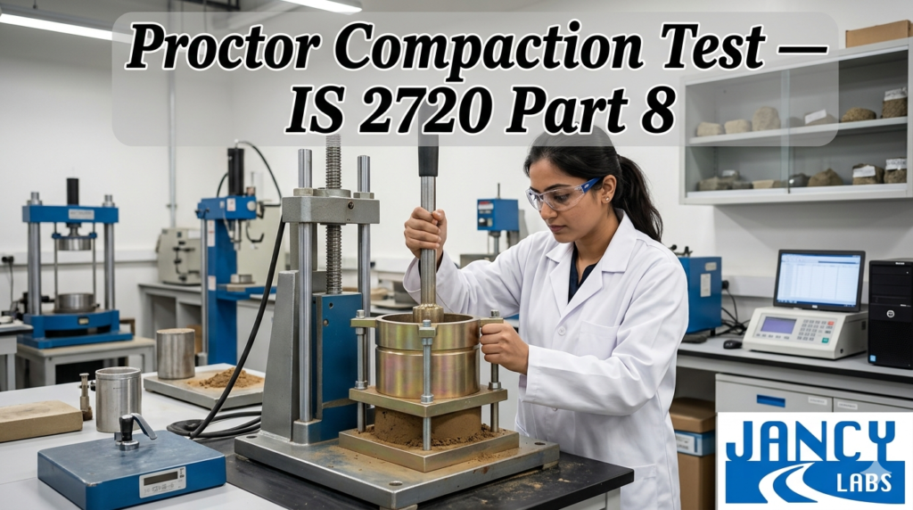 IS 2720 Part 8 specifies the exact compaction energy, mould dimensions, number of layers, and blows per layer for both standard and modified Proctor tests. Furthermore, it defines the precise rammer weight and drop height — so results stay consistent across all accredited labs. Jancy Labs therefore conducts this test strictly as per IS 2720 Part 8, with calibrated equipment, verified procedures, and no shortcuts.