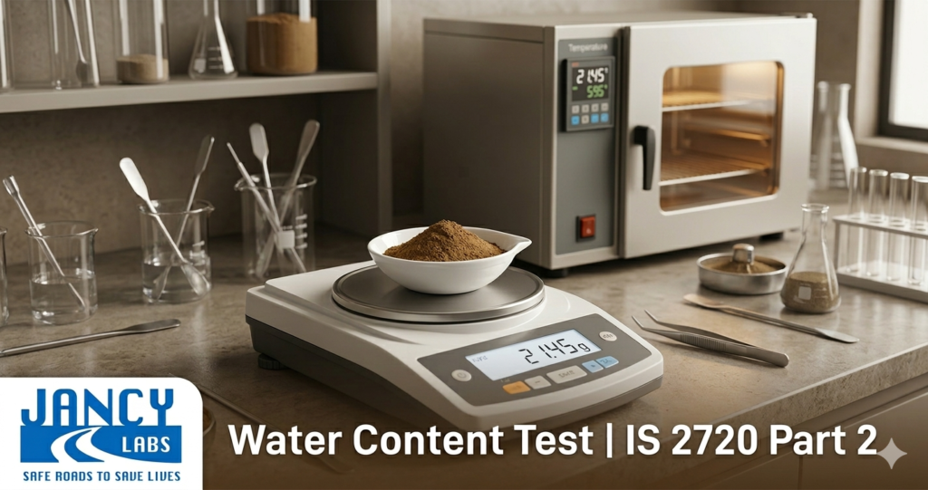 Jancy Labs conducts this test strictly as per IS 2720 Part 2; consequently, results are consistent and reproducible across all project submissions. Moreover, this standard guarantees that the oven-drying procedure, weighing precision, and reporting format meet Bureau of Indian Standards requirements. Therefore, your report is submission-ready for NHAI, PWD, and PMGSY without any further verification.
